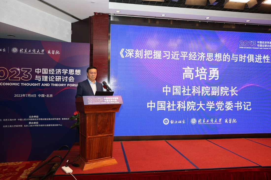 中国社会科学院副院长、中国社会科学院大学党委书记高培勇作了题为《深刻把握习近平经济思想的与时俱进性》的主旨演讲。他阐述了新发展理念在不同时期的表述变化,总结了习近平经济思想与时俱进性的重要体现,并对如何深刻把握习近平经济思想提出了建议。
