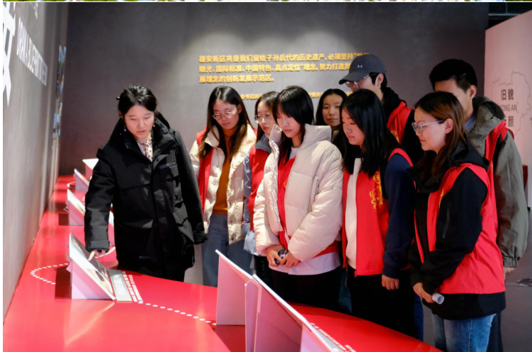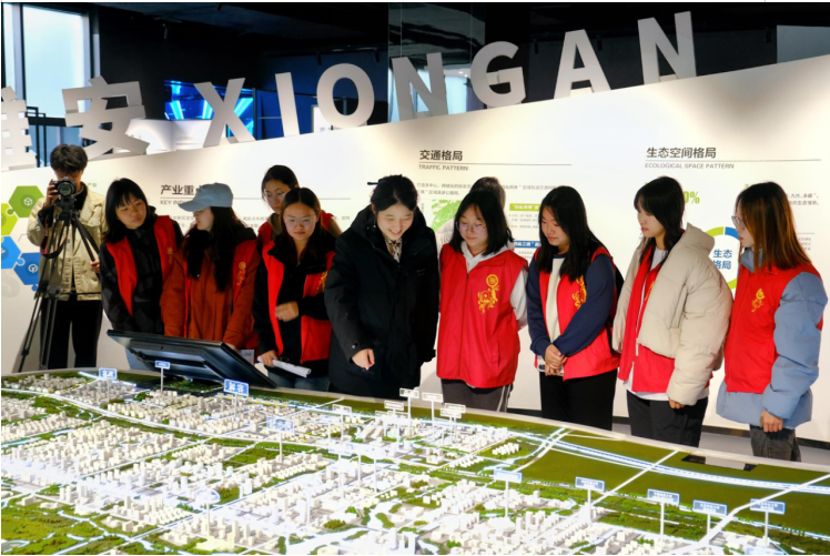 实践队伍来到了雄安规划展示中心,从基础设施的布局到生态环境的构建,从智慧城市的应用到人文关怀的细节,每⼀个细节都体现出了雄安的独特魅力。通过参观学习,同学们对雄安新区的整体规划及设计理念、智能城市、重点片区、重点项目规划建设情况等有了更为直观的认识,全面把握雄安新区作为国家级新区的重要战略地位及其在新时代背景下的使命担当。