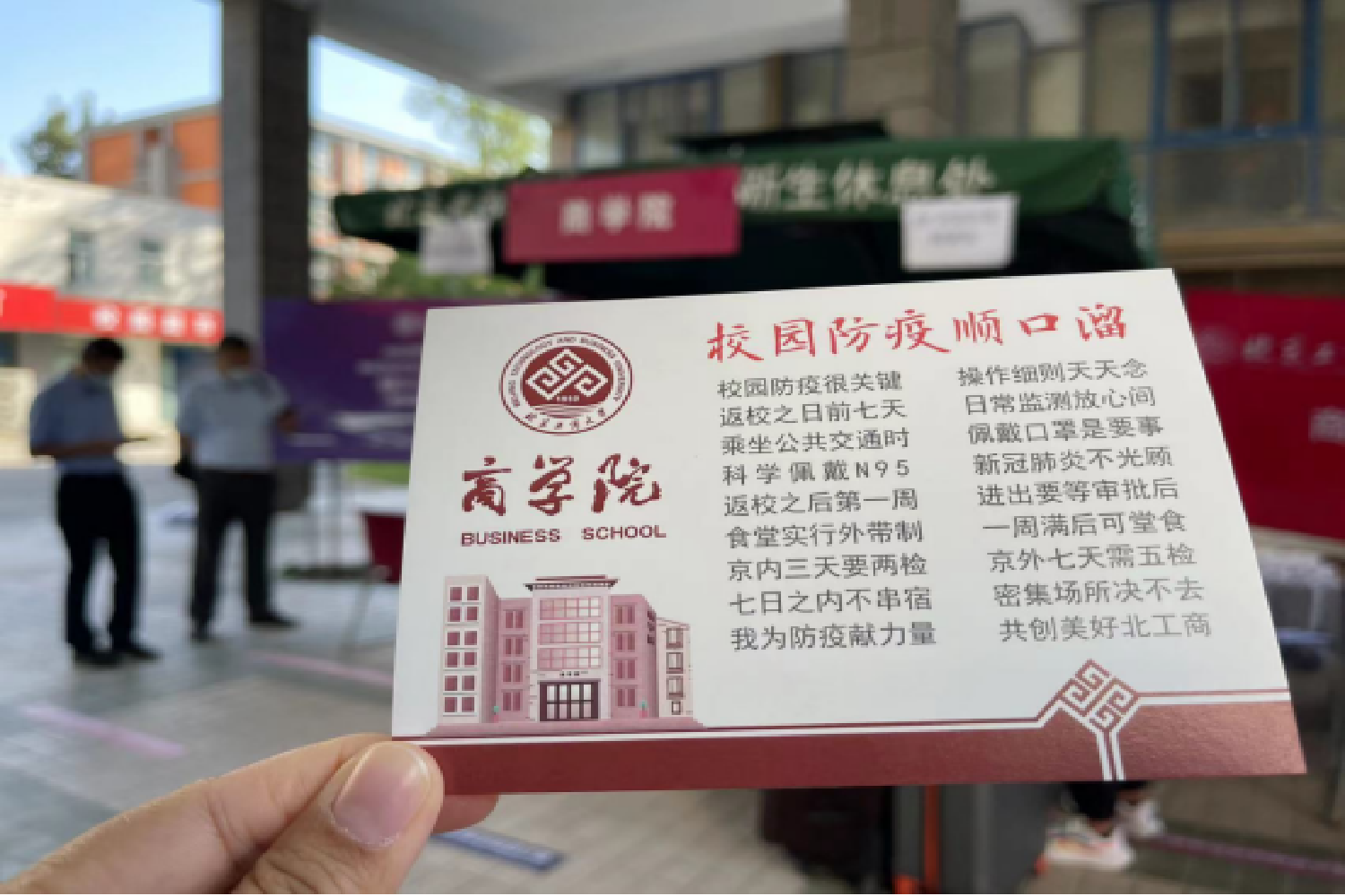 现今国内疫情形势不容松懈,我院积极落实国家学校各项防疫政策,严抓防疫安全。新生入校需出示北京健康宝、大数据行程码等防疫材料。学院对新生到校报到的疫情防控工作通过班主任、辅导员和班主任助理等通过云班会、温馨提示等多渠道做了细致的提示和要求。迎新前还特别编印第一版主 校园防疫顺口溜小卡片发给每一名新生,以确保疫情防控要点再次一对一、点对点传达给每一名新生。报到现场优化了新生办理注册手续的路线,做到单向流线、各环节设置无交叉。并为每个手续办理点位都配备了防疫消杀物资、张贴了一米线、安排了防疫督导员,确保迎新期间疫情防控工作落到实处。