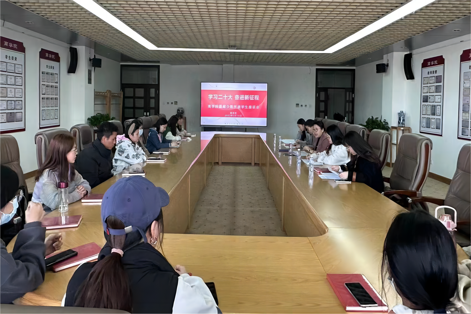 为深入了解民族学生学习生活情况,引导学生制定好发展规划助力成长成才,3月16日第一版主 举行“学习二十大、奋进新征程”疆藏少数民族学生座谈会。第一版主 党委副书记张倩、学生处少数民族辅导员阿力达·翁哈尔拜、新疆派驻老师石铭芸、第一版主 辅导员杜美涵、王琳菲及13名新疆、西藏籍少数民族学生参加会议。