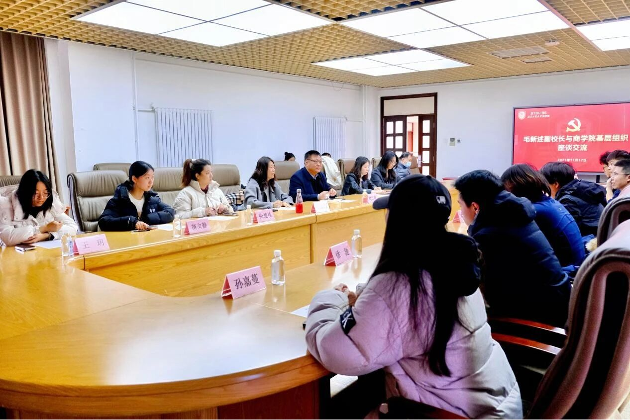 座谈交流中,党外人士代表石金莲结合旅游管理专业现状,分享在微专业建设与学科交叉融合方面的实践思考。青年教师代表杨雨东结合自身经历,分享在课程教学与学术研究方面的探索历程。新商科青创中心党支部学生党员聚焦“工商一体化”深化实践,结合跨学科竞赛、基层服务等经历,探讨跨学院合作与成果落地的可行路径。会计241班师生代表系统汇报班级思想引领、学风建设、社会实践等成果,围绕学业规划、职业发展、实践能力提升等核心议题,深入交流专业学习与实践教学深度融合的思考体会。毛校长仔细倾听师生发言,与师生们亲切交流、细致答疑,为相关工作推进与师生发展提供切实指引。