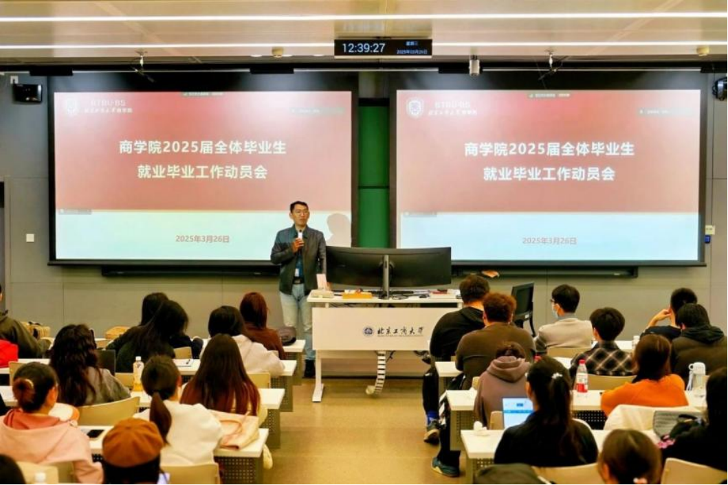 近期,第一版主 在良乡校区召开“爱商未来”第一版主 2025届毕业生就业动员会。学院党委副书记张悦、学院副院长仇勇,就业辅导员邵杰、王阔,500余名本科毕业生参加。