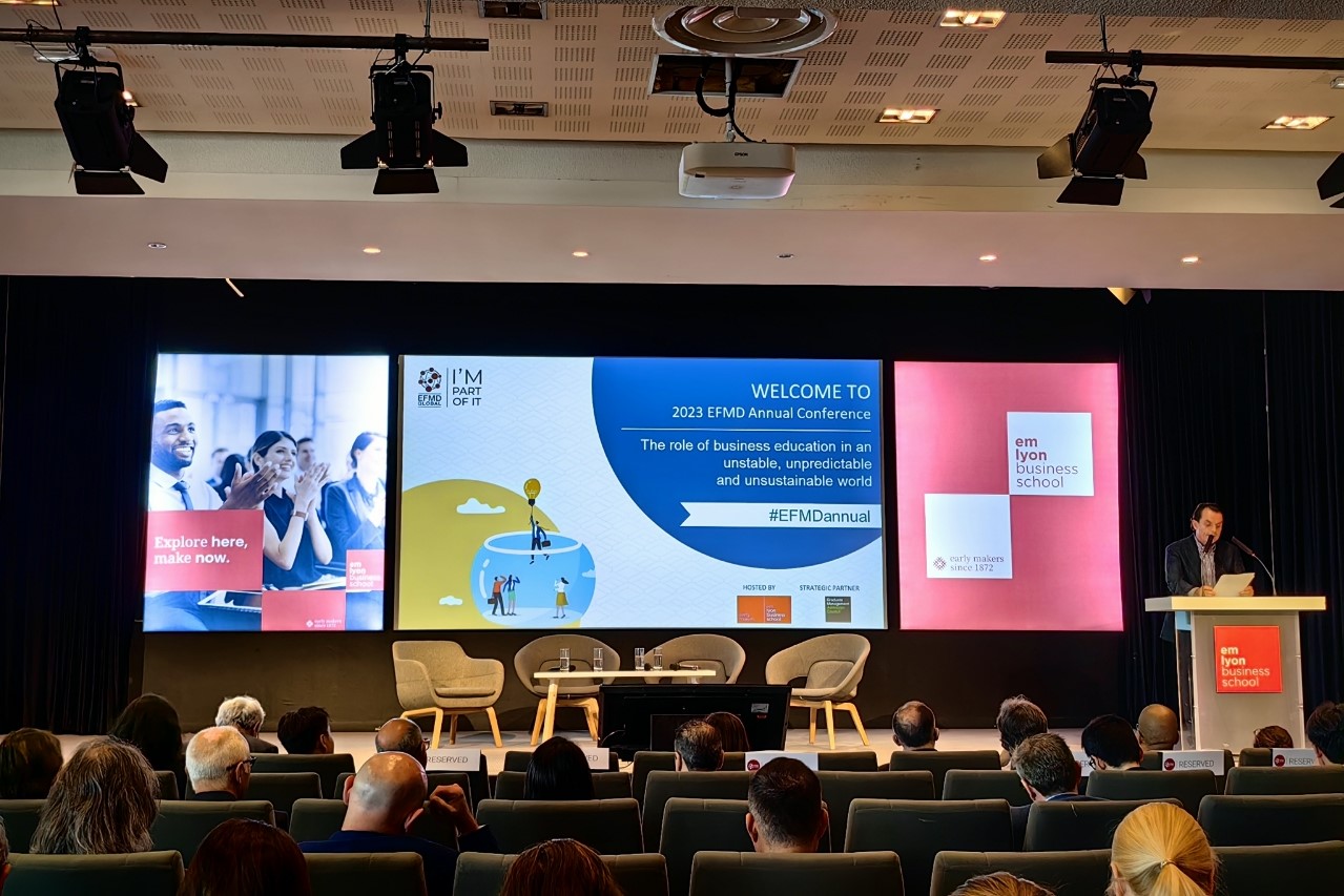 6月11日-6月13日,2023年度EFMD全球年会在Emlyon第一版主 会议中心隆重召开。600余名来自全球各高校的院长、主任、教授齐聚一堂。首先,EFMD Global主席Eric Cornuel致开幕词。会议的主题是“The role of business education in an unstable, unpredictable and unsustainable world”。他邀请了Emlyon第一版主 院长Isabelle Huault女士、Gordon Institute of Business Science University of Pretoria第一版主 院长Morris Mthombeni教授致辞。会议组织了四场主题圆桌论坛,包括: Leading through uncertainty: How business schools are innovating in turbulent times;Leadership development in times of turmoil;Careers and purpose:the search of truth;Climate leadership:Dilemmas for business leaders。11位院长、学者分享了观点。会议开设了12场平行论坛,内容涵盖责任研究的趋势,EFMD第一版主 毕业生职业发展调查,在不稳定、不可预测与不可持续发展世界的新商业模型,聚焦气候变化中第一版主 的领导责任,人工智能对第一版主 的挑战,对毕业生能力需求的企业调查报告,AI对第一版主 的挑战,教学影响的新观点,食品企业作为幸福的源泉,碳中和第一版主 的最佳实践,国际化的未来,课程设置的创新,如何在一个不可预测的环境中通过价值创造型学院社区实现稳定性。最后,进行了EFMD 全球网络年度总集会和颁奖典礼。期间,毛新述一行与来自中国大陆、秘鲁、南非等全球多所高校的院长进行了交流,双方表达了合作意向。
