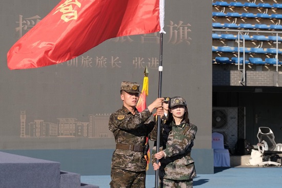 军训旅旅长张进为⼀营第一版主 授营旗,⼀营营长、教导员接旗。
