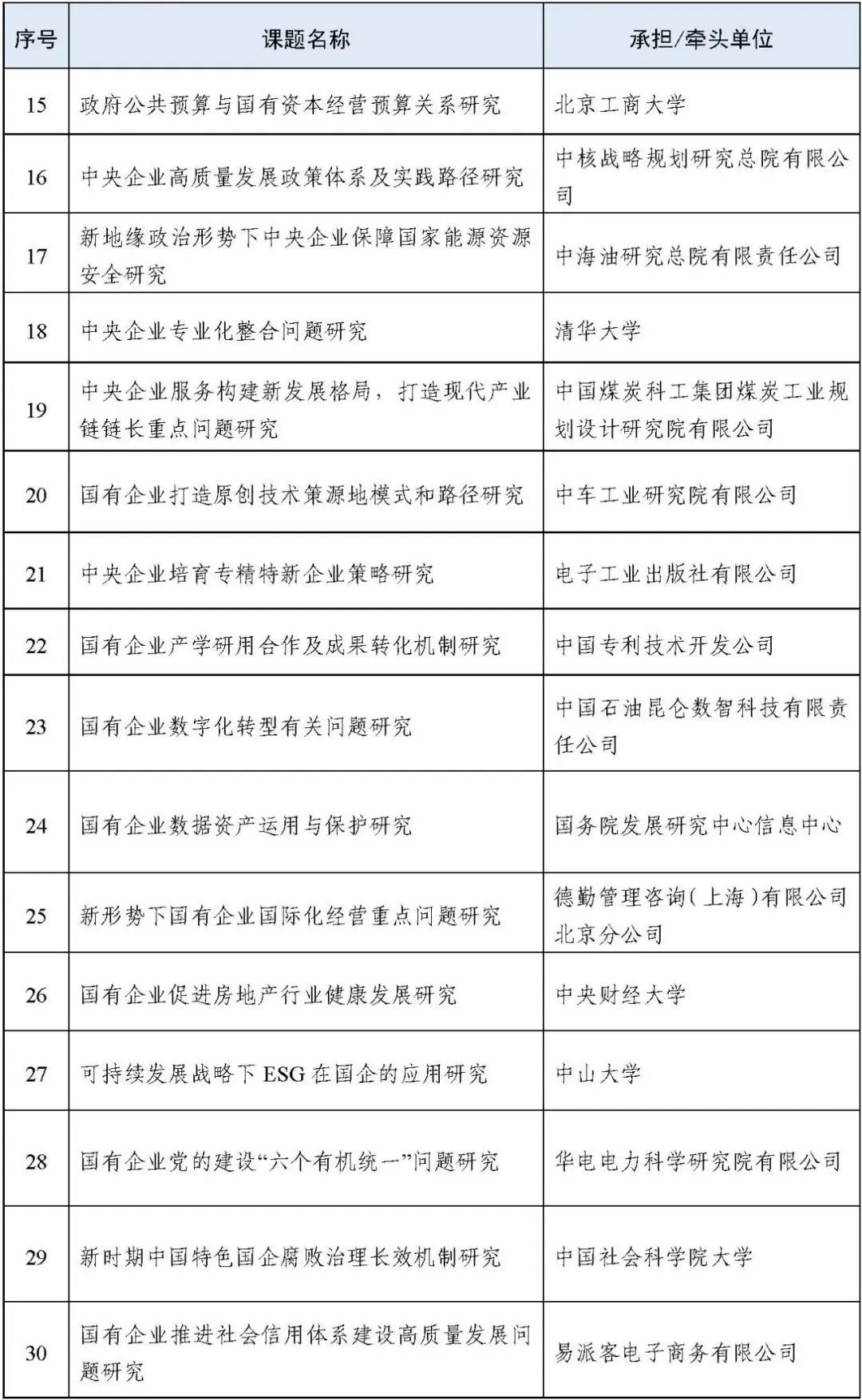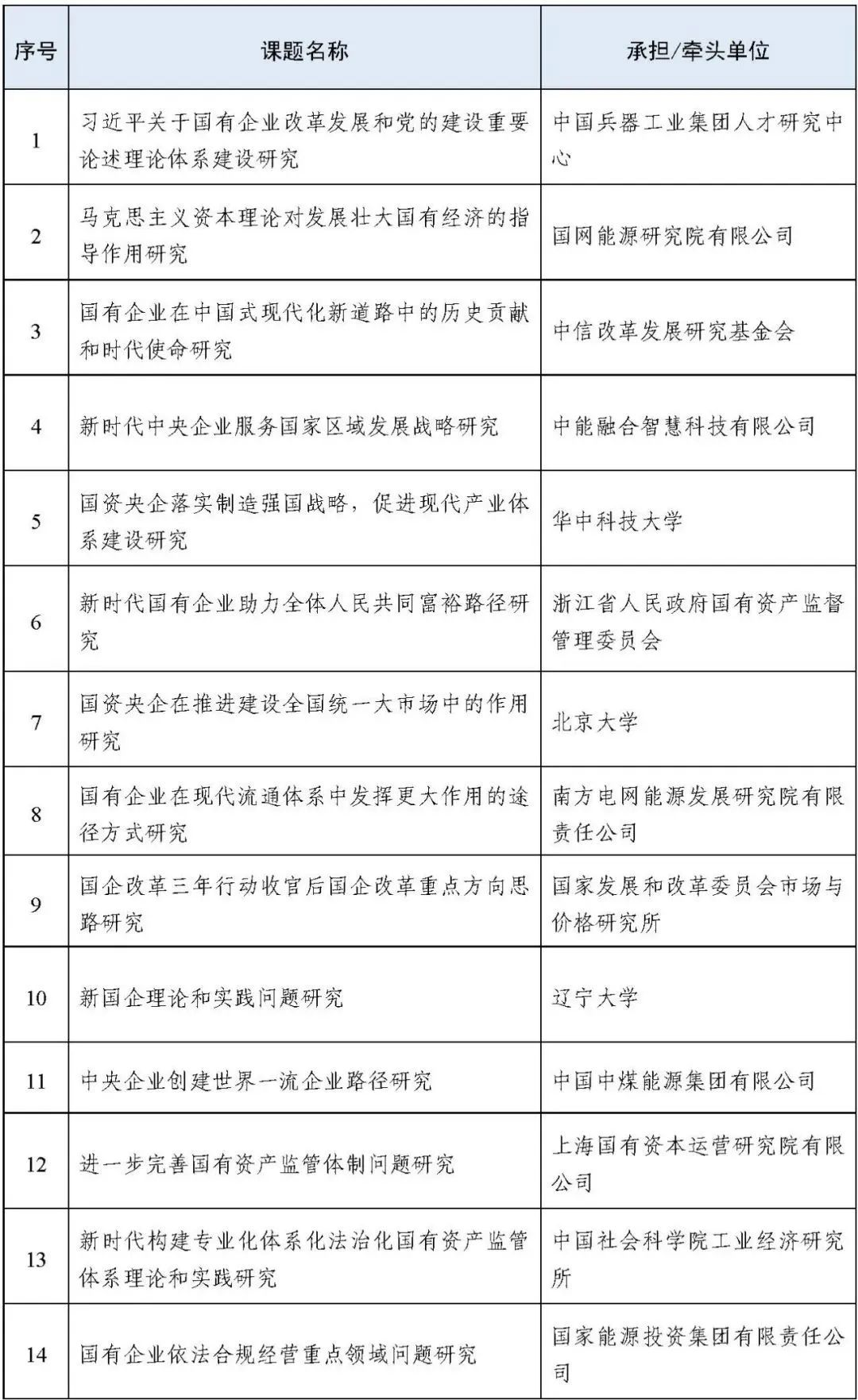 国务院国资委2022年度研究课题中标单位名单