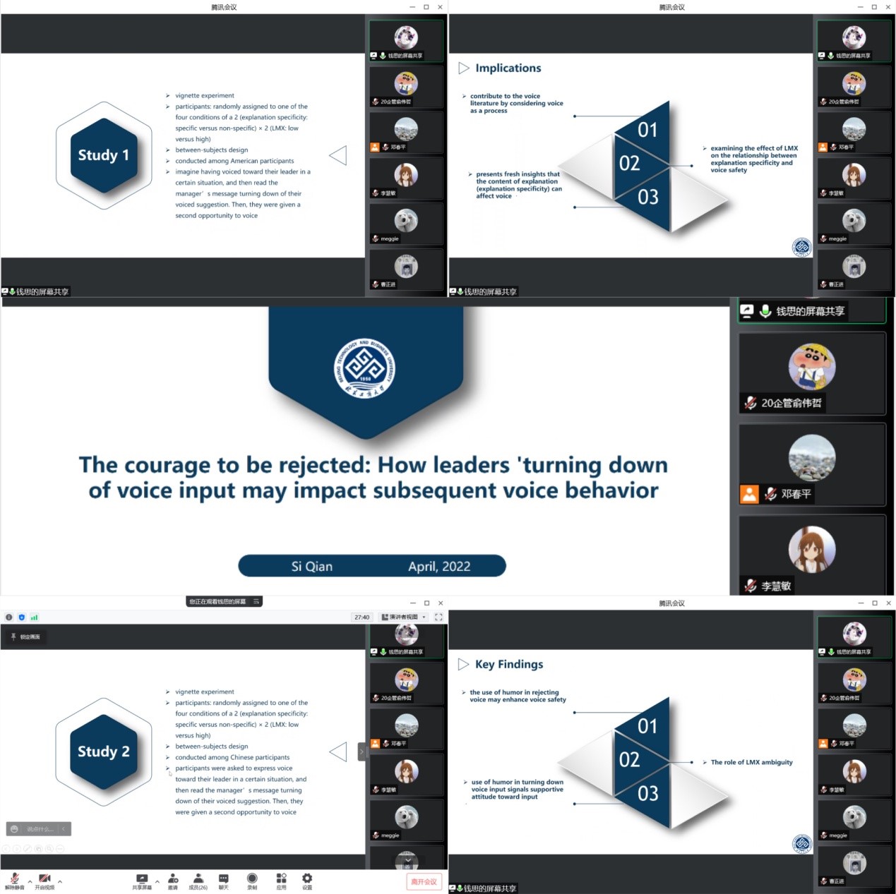 分享结束后,教师与学生就相关问题与钱思博士进行了答疑互动。钱思博士的主要研究领域包括创业团队、员工建言行为等,目前已在《管理科学》、《管理学报》、《Current Psychology》等国内外权威期刊发表多篇论文,部分论文曾被人大复印报刊资料全文转载。论文多次被美管理学年会(AOM)、中国管理研究国际学会(IACMR)等国际国内会议录用。