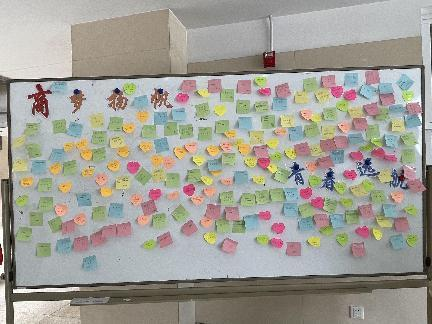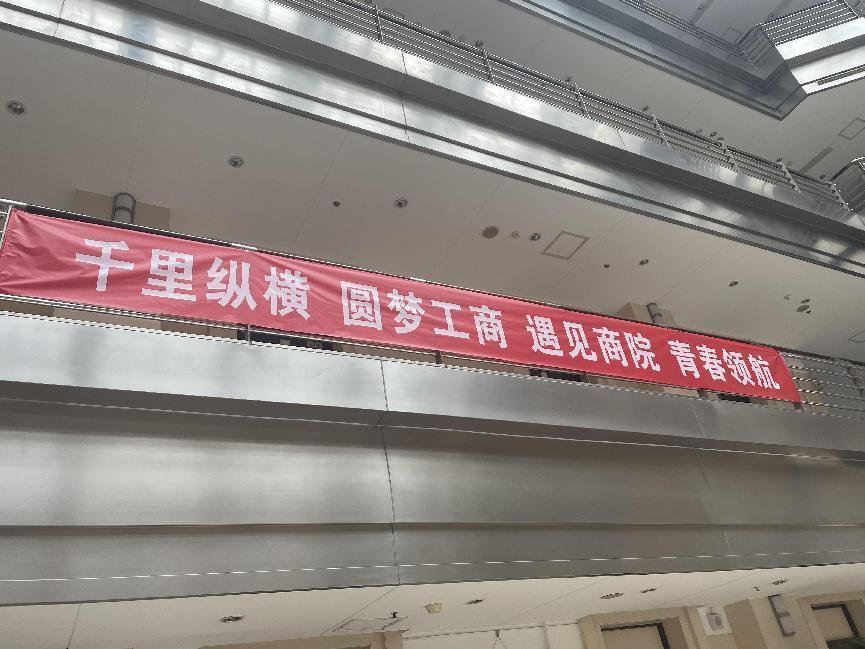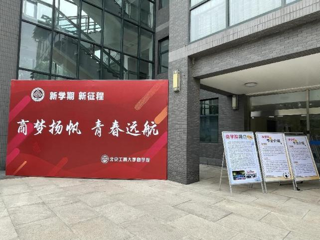 在商楼外,摆放了关于学院、专业、班主任及辅导员的介绍展板,通过专门的介绍,新生们对学院和老师们都有了更加深刻、更加直观的印象。“商梦扬帆 青春远航”的迎新大展板更是给同学们带来了归属感与亲切感,并激励新生要心怀梦想再奋进。商楼内,志愿者们精心制作了“未来可期”“我们开学啦”等精美的迎新手牌;悬挂了“千里纵横 圆梦工商 遇见商院 青春领航”“五湖四海齐聚工商,同心共筑商院辉煌”的迎新条幅,希望新生们能从激励语中感受到浓浓的关爱,汲取力量,在大学生活中奋勇拼搏,不负青春,不负韶华!商楼大厅转角处,学院开展了“畅想你的大学生活——商梦扬帆寄心语”特色活动,让新生畅想未来,将写满期待与憧憬的寄语张贴在背景板上,商梦由此启航!