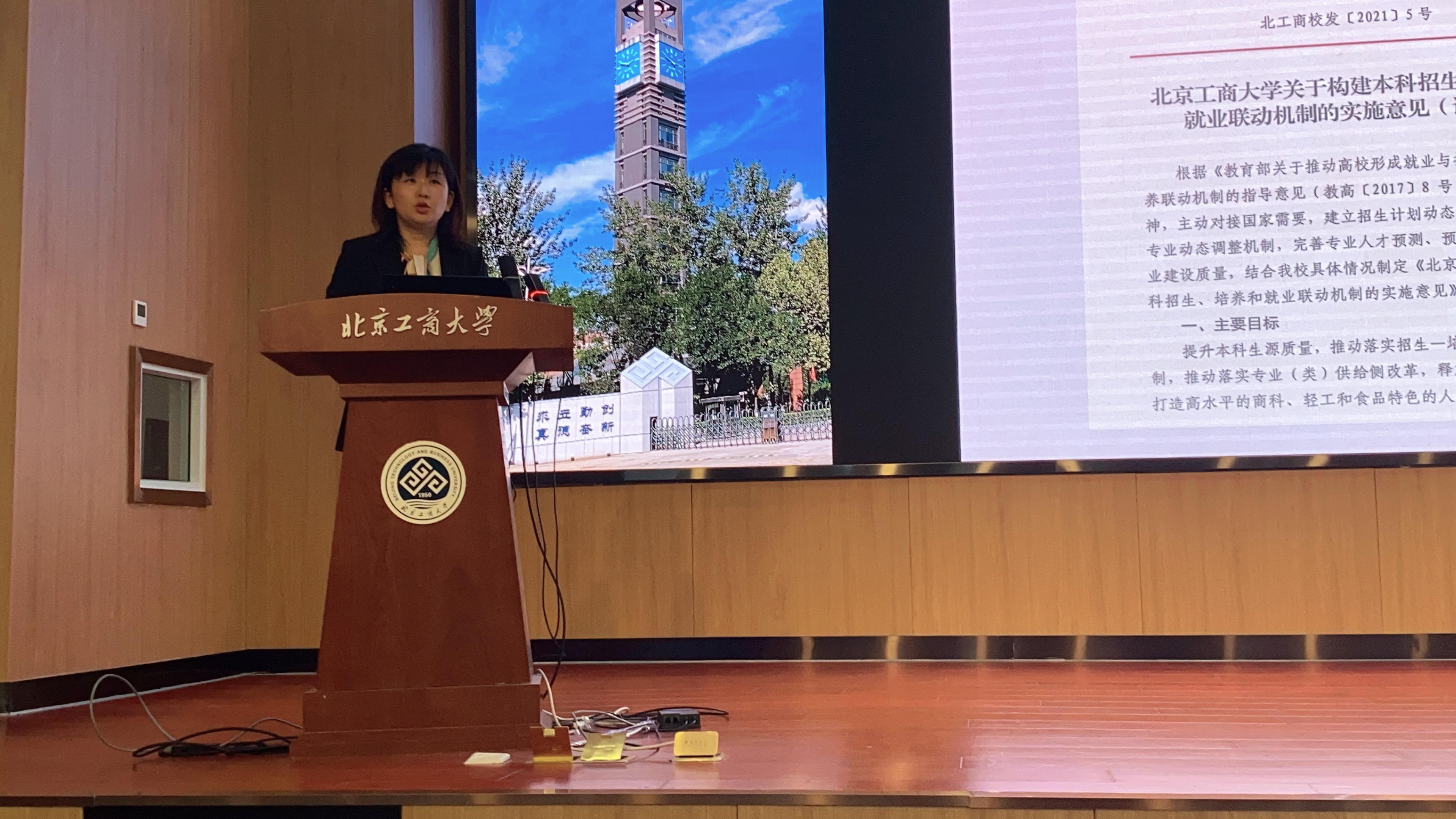 副院长王楠就近期教学工作进行了总结和说明。她介绍了近期学校开展的教育教学总结表彰工作,列举了学院2020年荣获的一流本科专业建设、一流本科课程、“优质本科教材课件”、教学名师、课程思政优秀教师等在内的九方面本科教育教学工作奖励,指出第一版主 还有很大的进步空间,希望老师们更加重视教育教学工作。随后,她对近期主要工作进行了介绍,包括教育教学成果奖申报、新文科研究与改革实践项目、北京市青年教学名师申报、国家级一流本科课程申报和“挑战杯”首都大学生课外学术科技作品竞赛,强调一流专业申报是重点工作。最后,她还谈到了后续需注意的几项工作,包括教学检查、期末试卷出题、留学生管理和马工程教材使用等要求,并着重强调了学校出台的关于构建本科招生、培养和就业联动机制的实施意见,对评价指标、我院各专业的评价情况进行了详细说明,对学校采取的联动措施进行了介绍,希望老师们能够高度重视本专业的人才培养和就业,不断推进学生培养。