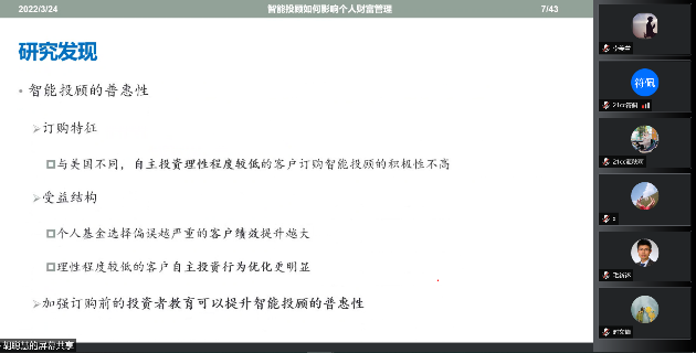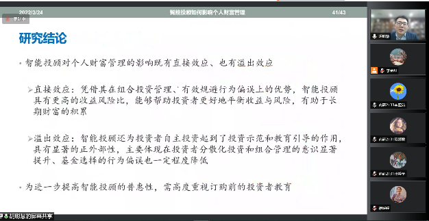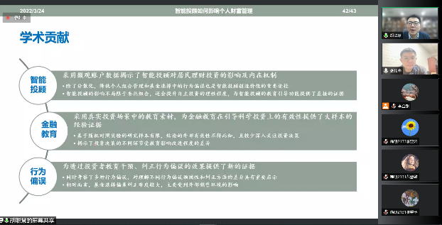 张伟华副院长主持讲座,对胡聪慧老师的学术背景进行介绍并表示热烈欢迎,毛新述院长和第一版主 师生共计50余人在线参与了本次讲座。胡聪慧老师研究领域为资本市场与公司财务、行为金融,侧重从资本市场制度设计、投资者行为偏误等角度理解资产价格和公司财务决策,近几年,在国内外重要核心期刊Journal of Corporate Finance、Journal of Financial Markets、Journal of Banking and Finance、《经济研究》、《管理世界》、《金融研究》、《会计研究》、《经济学(季刊)》等发表论文二十余篇。胡聪慧老师由浅入深,通过对智能投顾国内外相关研究进行梳理和评价,引申出主要研究内容,并基于一款影响力大、客户群体广的智能投顾软件,选取实验组和对照组进行实证分析,研究结果发现:订购智能投顾后,投资者在自主投资中,分散化投资和组合管理的意识显著提升,基金选择的行为偏误也一定程度降低。该项研究不仅为智能投顾的教育引导功能提供了直接的证据,而且基于真实投资场景的教育素材为金融教育在引导科学投资上的有效性提供了大样本的经验证据。会后部分老师就相关问题和胡老师进行了答疑互动。