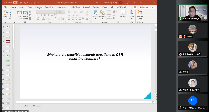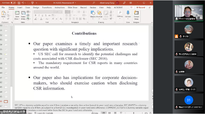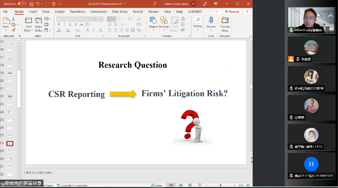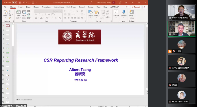 2022年4月18日,学院举办会计&财务学术报告之青年学者论坛第1期,有幸邀请中国香港理工大学会计&金融学院教授、博士生导师曾晓亮老师,为第一版主 会计系和财务系师生在线开展题为“CSR Reporting Research Framework”的学术讲座。